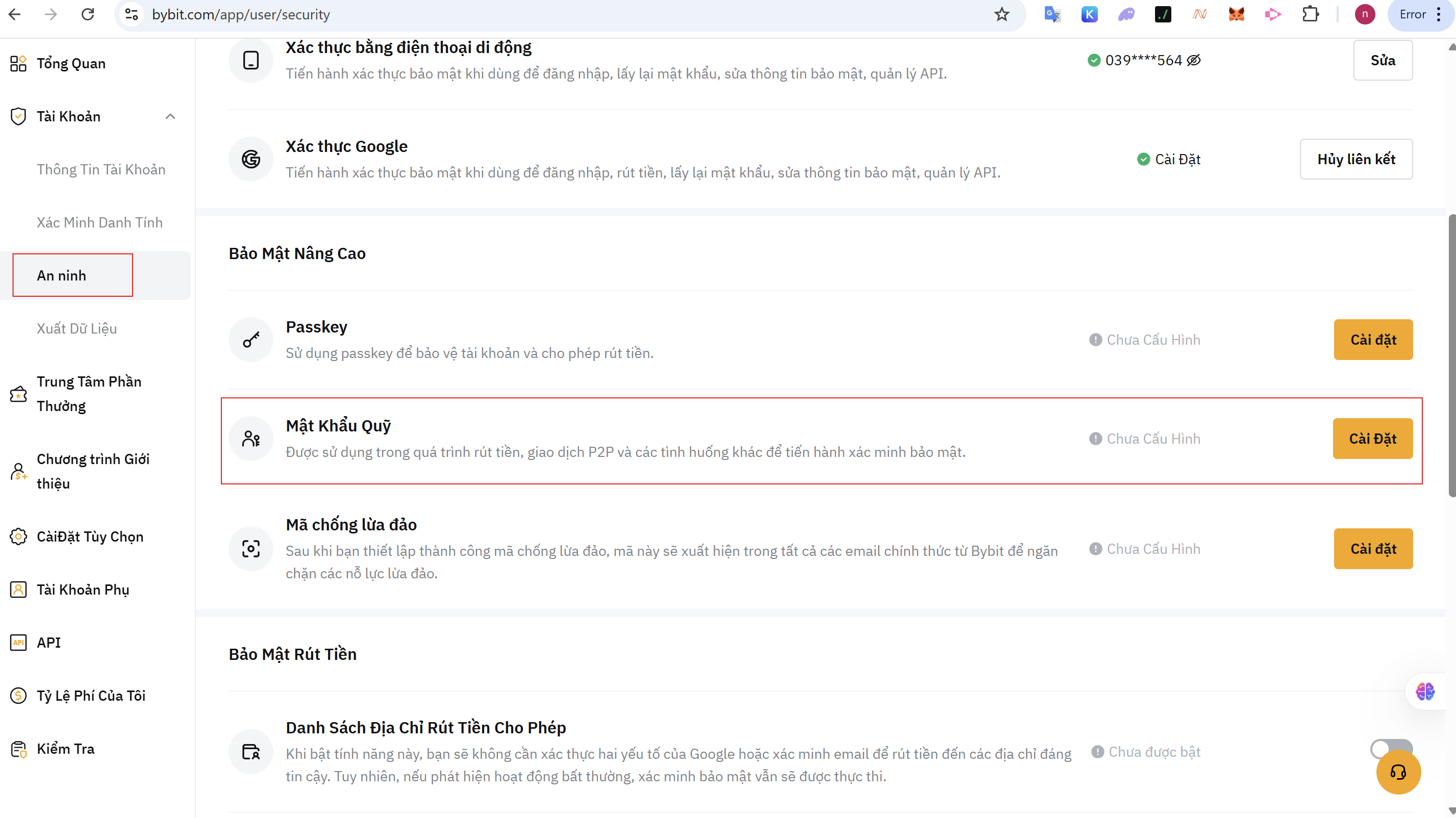 Đây là một lớp mật khẩu thứ hai, được sử dụng trong quá trình rút tiền, giao dịch P2P và các tính năng bảo mật khác. Nó đảm bảo rằng ngay cả khi ai đó truy cập được vào tài khoản của bạn, họ cũng không thể rút tài sản đi nếu không biết mật khẩu này. Tên cũ của tính năng này là “Mật khẩu rút tiền”.