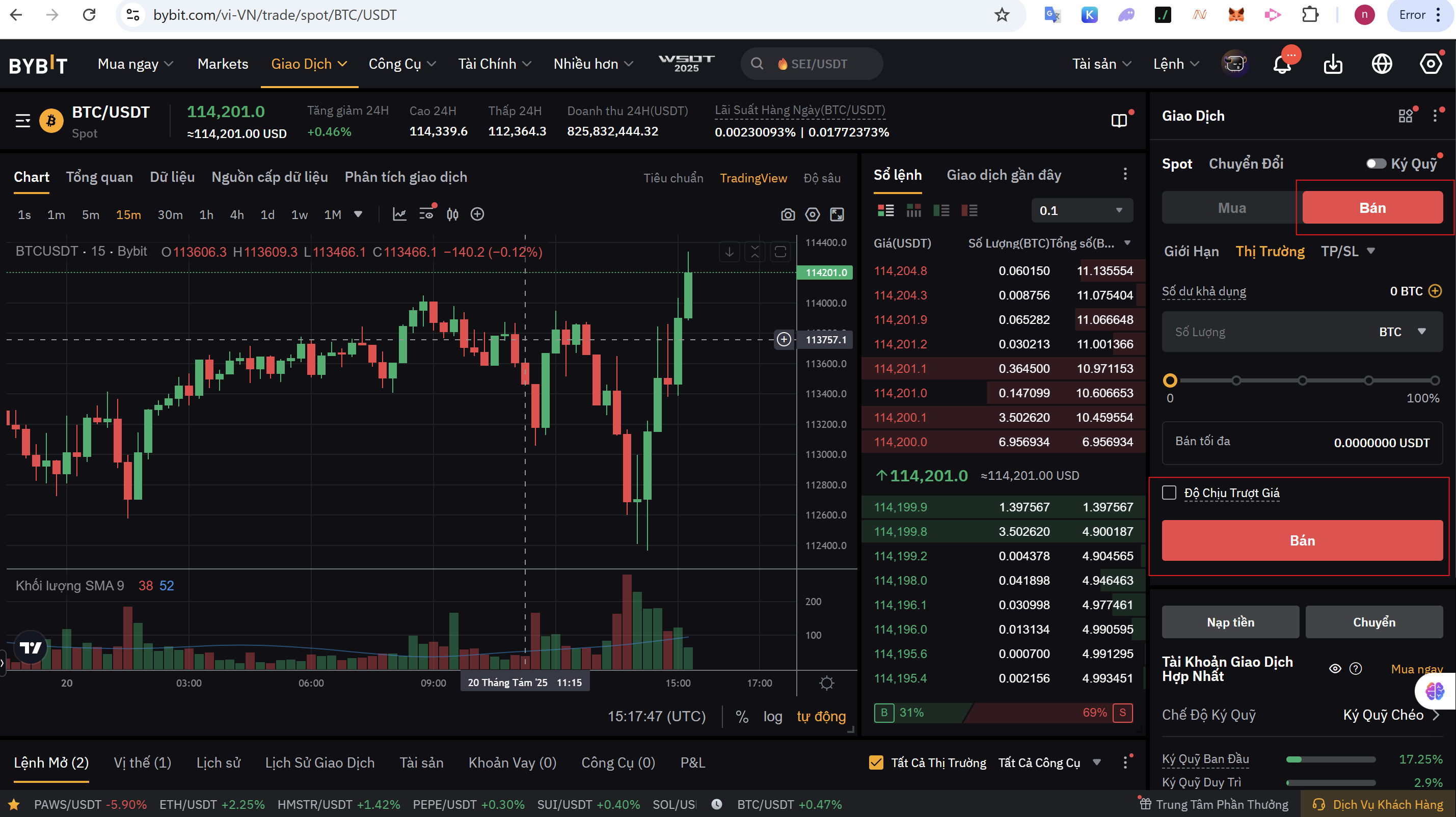 - Lệnh Market (Bán Ngay): Chọn tab “Market”, nhập số lượng coin muốn bán và nhấn “Bán BTC”. Lệnh sẽ được thực hiện ngay lập tức với giá tốt nhất thị trường.