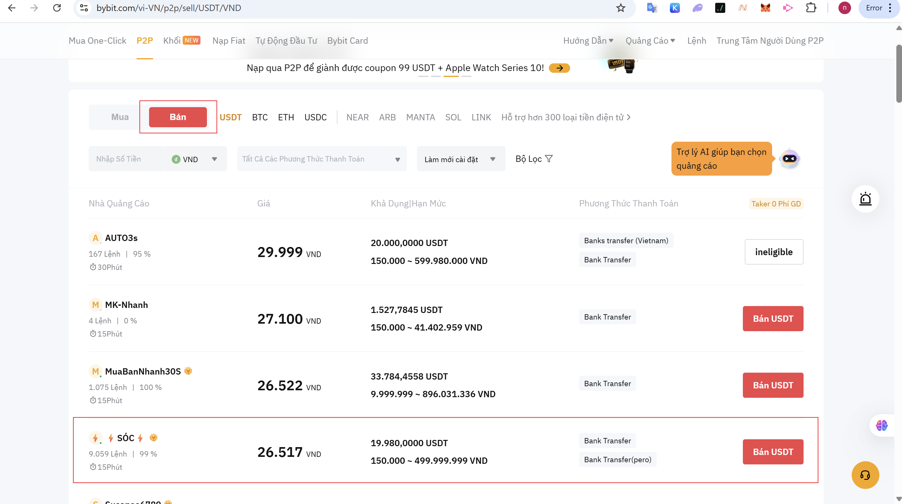 - Chọn một người mua uy tín (ưu tiên người có tỷ lệ hoàn thành cao và nhiều lệnh đã thực hiện). Nhấn nút “Bán USDT”.