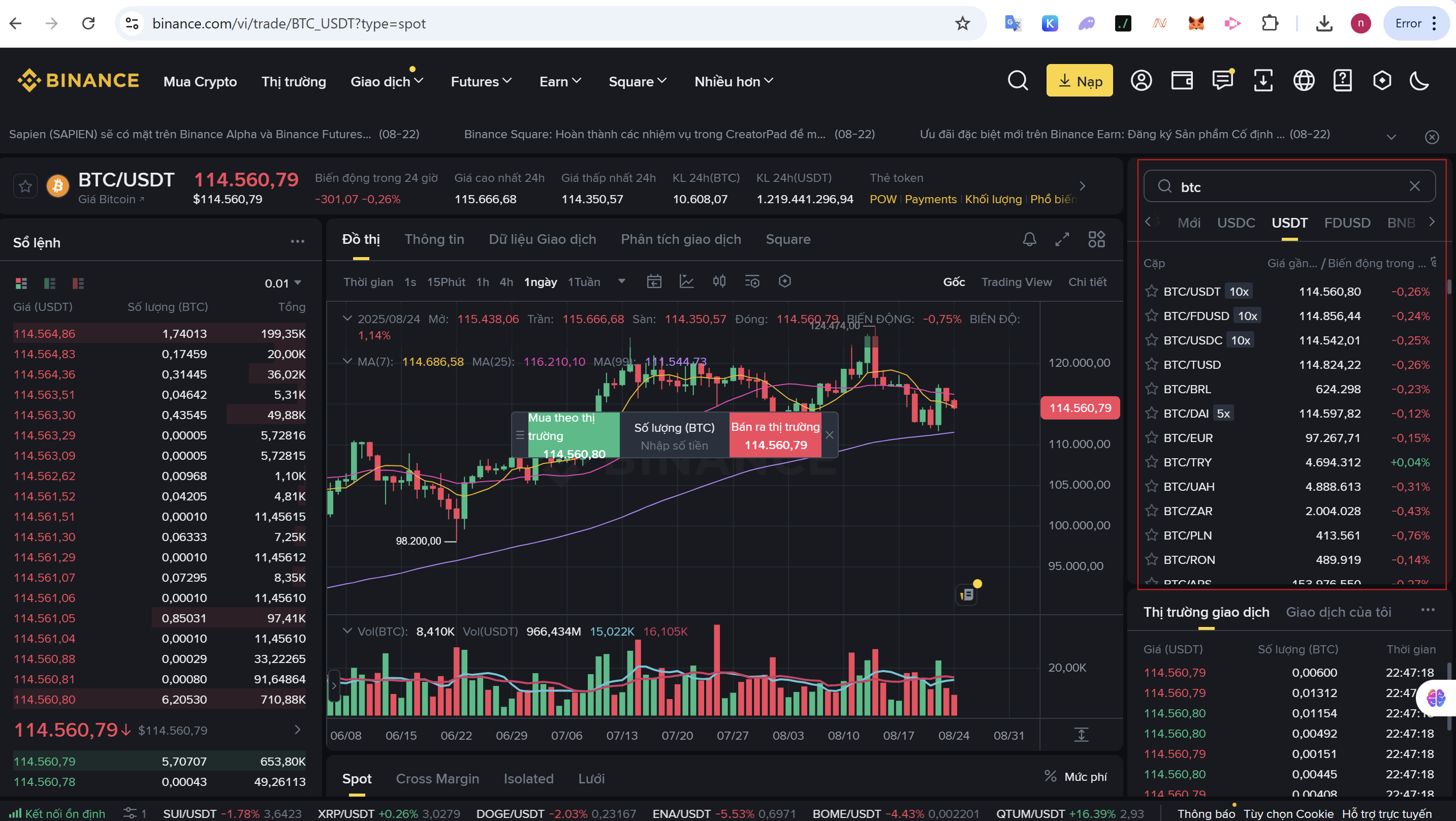 - Ví dụ: Nếu bạn muốn mua Bitcoin bằng USDT, hãy chọn cặp BTC/USDT.