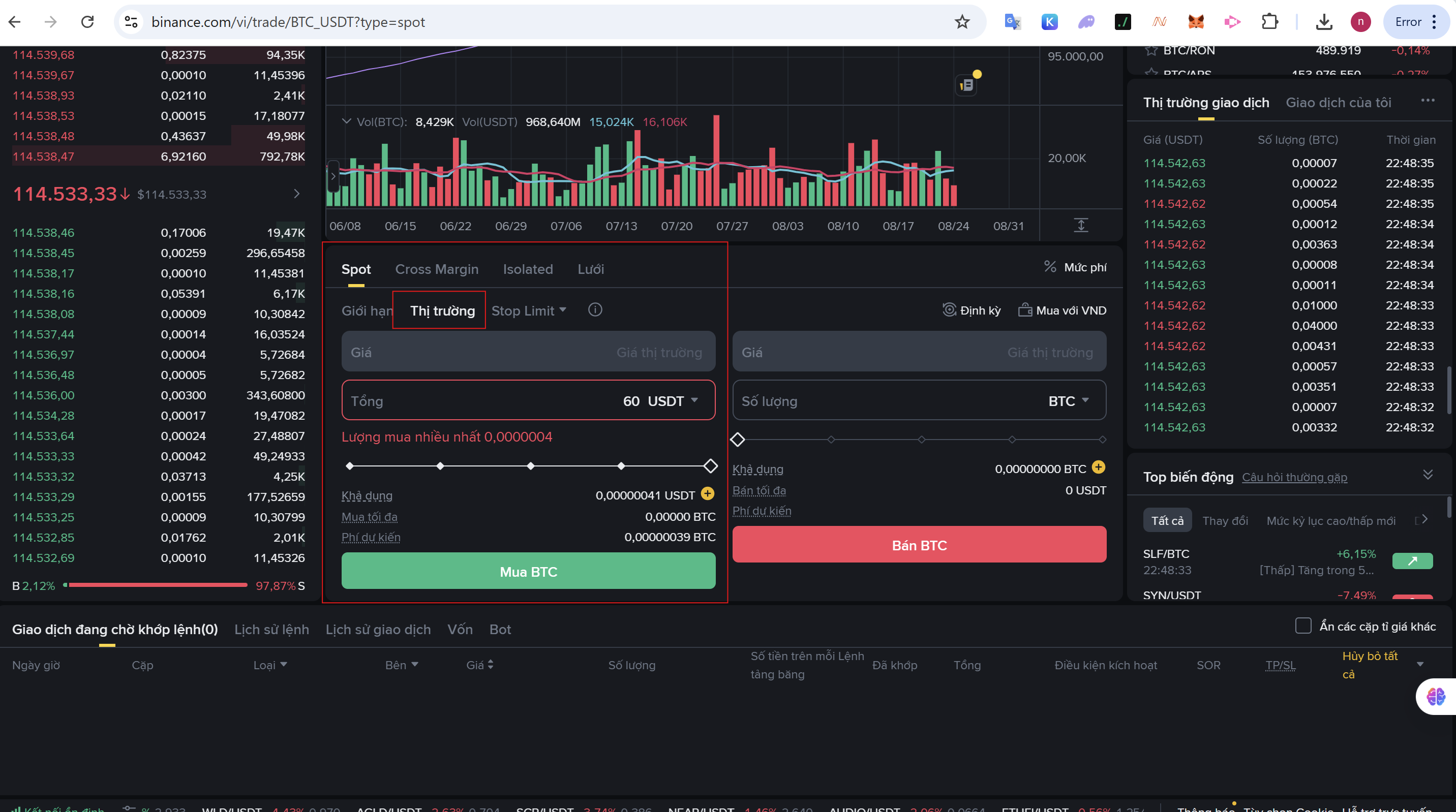 - Lệnh Thị Trường (Bán): Chọn tab “Thị trường”, nhập số lượng BTC muốn bán và nhấn nút “Bán BTC”.