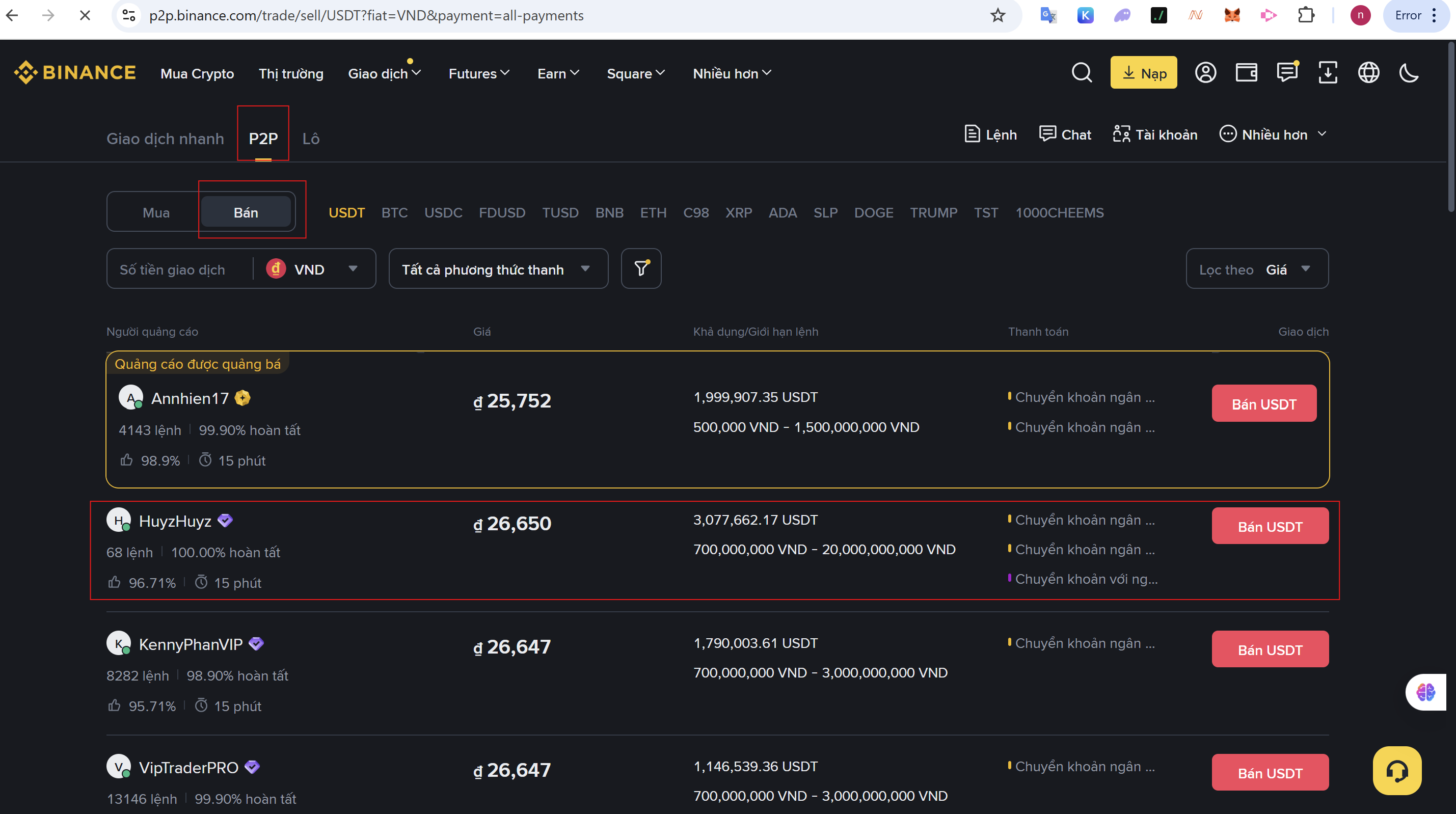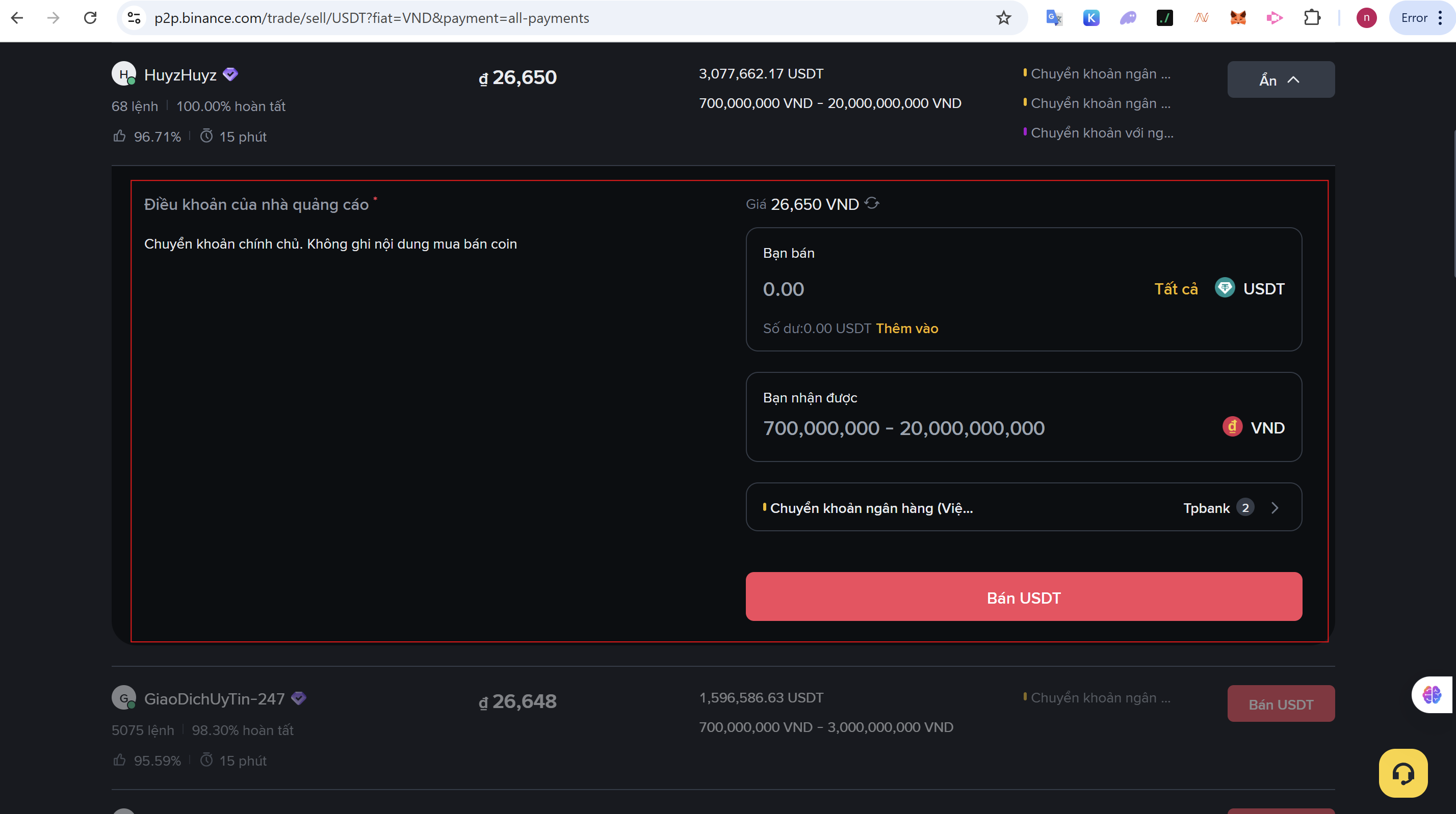 Bước 3: Thực Hiện Lệnh Bán USDT trên P2P
